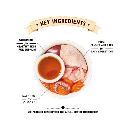 65% Frisch zubereitet: Huhn (30%); Forelle (10%); Schweinefleisch (21%); Rindfleisch (4%), Mineralien, Lachsöl, Algen