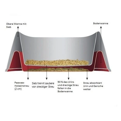 Katzentoiletten von PeeWee zeichnen sich durch besondere Bedienungsfreundlichkeit und Nachhaltigkeit aus. Die Auffangwanne der PeeWee Katzentoilette ist aus zwei Einzelwannen aufgebaut, von denen die obere im Bodenbereich ein Gitter enthält. Wenn die Katze uriniert, verschwinden sofort etwa 90% der Flüssigkeit durch das Gitter der oberen Wanne in der dichten Bodenwanne. Der restliche Urin wird in der speziellen Streu, die auf dem Gitter liegt, aufgefangen. Diese quellen bei der Aufnahme der Flüssigkeit auf und zerfallen zu Sägemehl. Dies wird dann beim Verscharren durch die Öffnungen im Gitter nach unten transportiert, sodass die Streu in der oberen Wanne stets frisch und sauber bleibt. Die Katze verlässt das Klo mit sauberen und trockenen Pfoten. So finden sich auch außerhalb der Katzentoilette keine Spuren mehr!